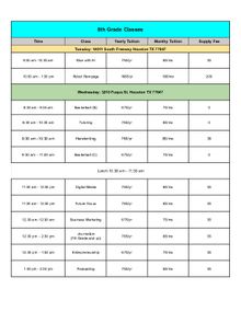 8th Grade Schedule & Tuition PDF Tuition and supply fees are listed per class. Supply fees are charged once per class for the school year. Tuition may be paid monthly, per semester, or for the full year in advance. All registration, tuition, and supply fees are non-refundable. Download "8th grade Spring 2026.pdf"